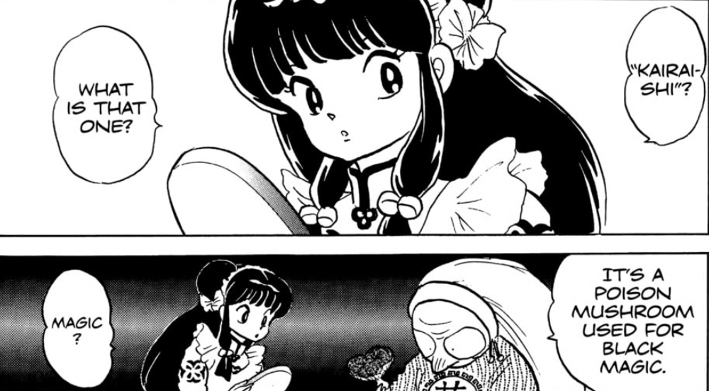 MANGA: Cologne accidentally gets an order of kairashi mushrooms and explains to a curious Shampoo what they are. She demonstrates them on the delivery man. Shampoo dreams of using its magic to force Ranma to hug her and happily buys them.