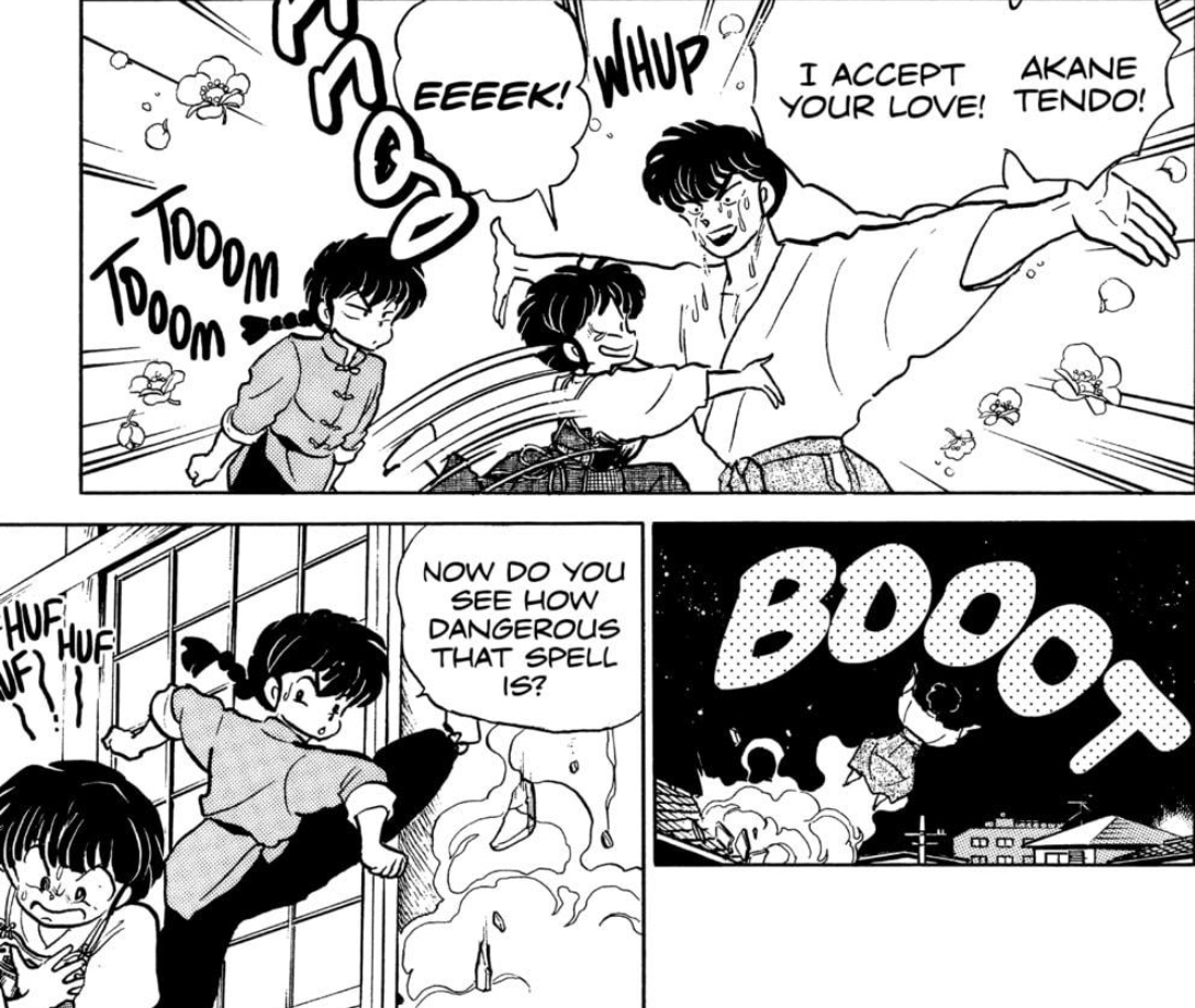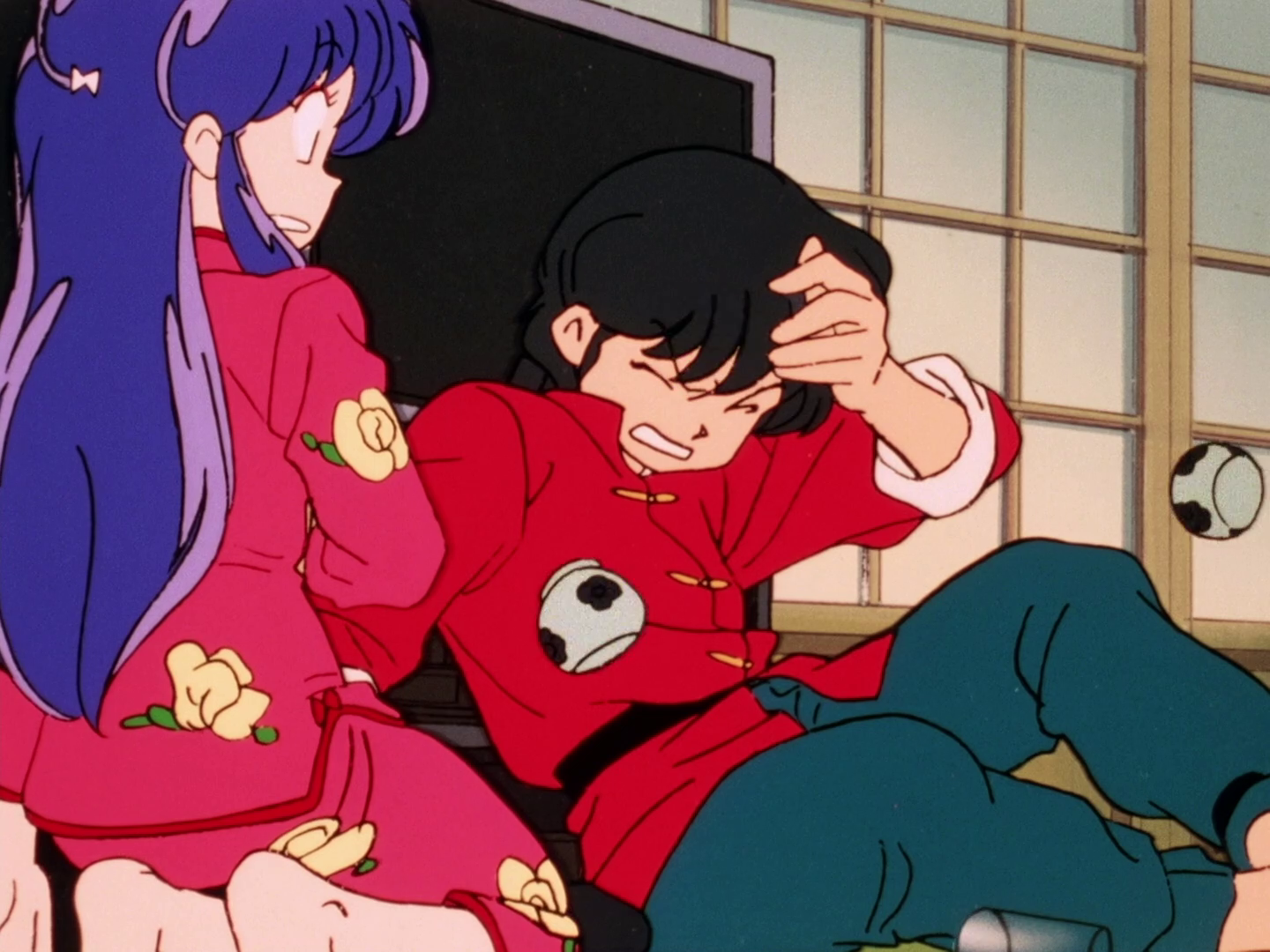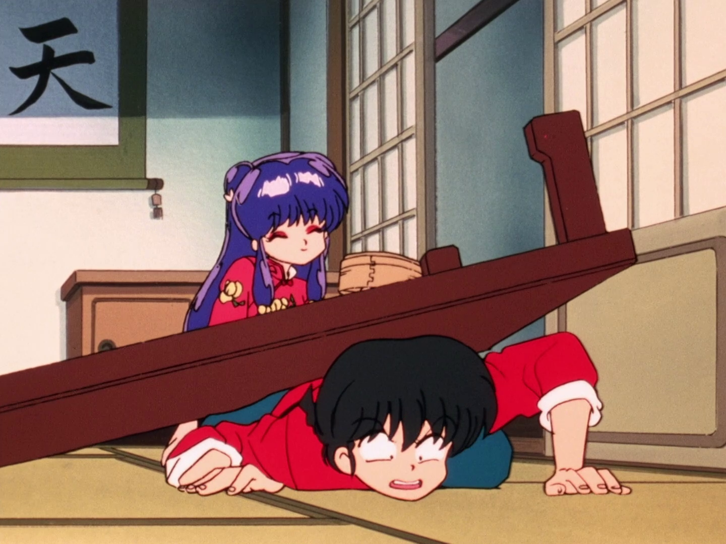 ANIME: Shampoo busts through a wall, interrupting their romantic moment, and tries to get Ranma to eat more of the kairashi. He refuses. She makes him sneeze, so he hugs her. Akane sneezes next, but when he goes to hug her, she shoves him away and begins throwing random objects at him - multiple books, pouches, cushions, cups, a kettle - and calls him a “perverted, cross-dressing, immoral sex fiend.” She throws a dumbbell at him which breaks the TV and then lifts a table next. Ranma, fed up, yells that he’s "not hugging her because he wants to!” This hurts Akane’s feelings so she drops the table (on him) and goes running dramatically back to her room.