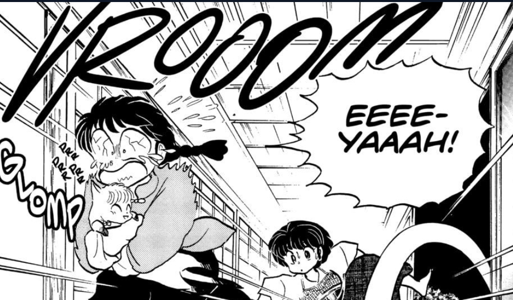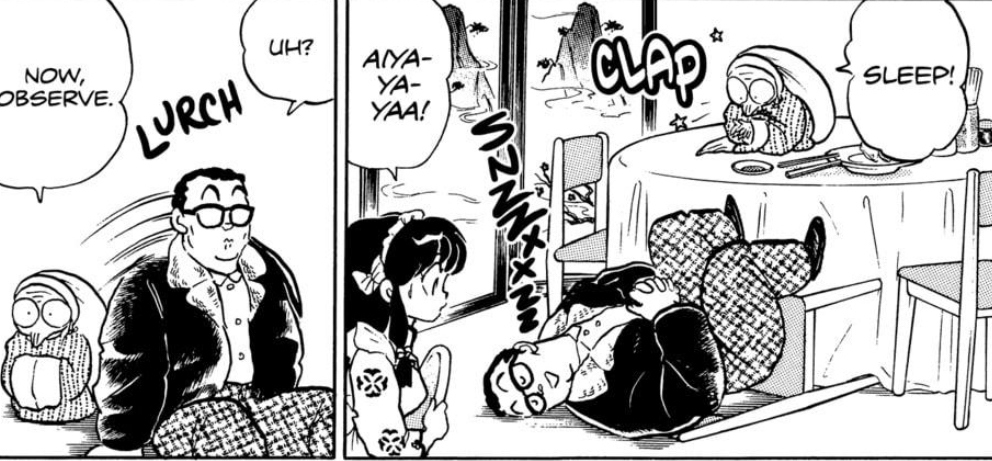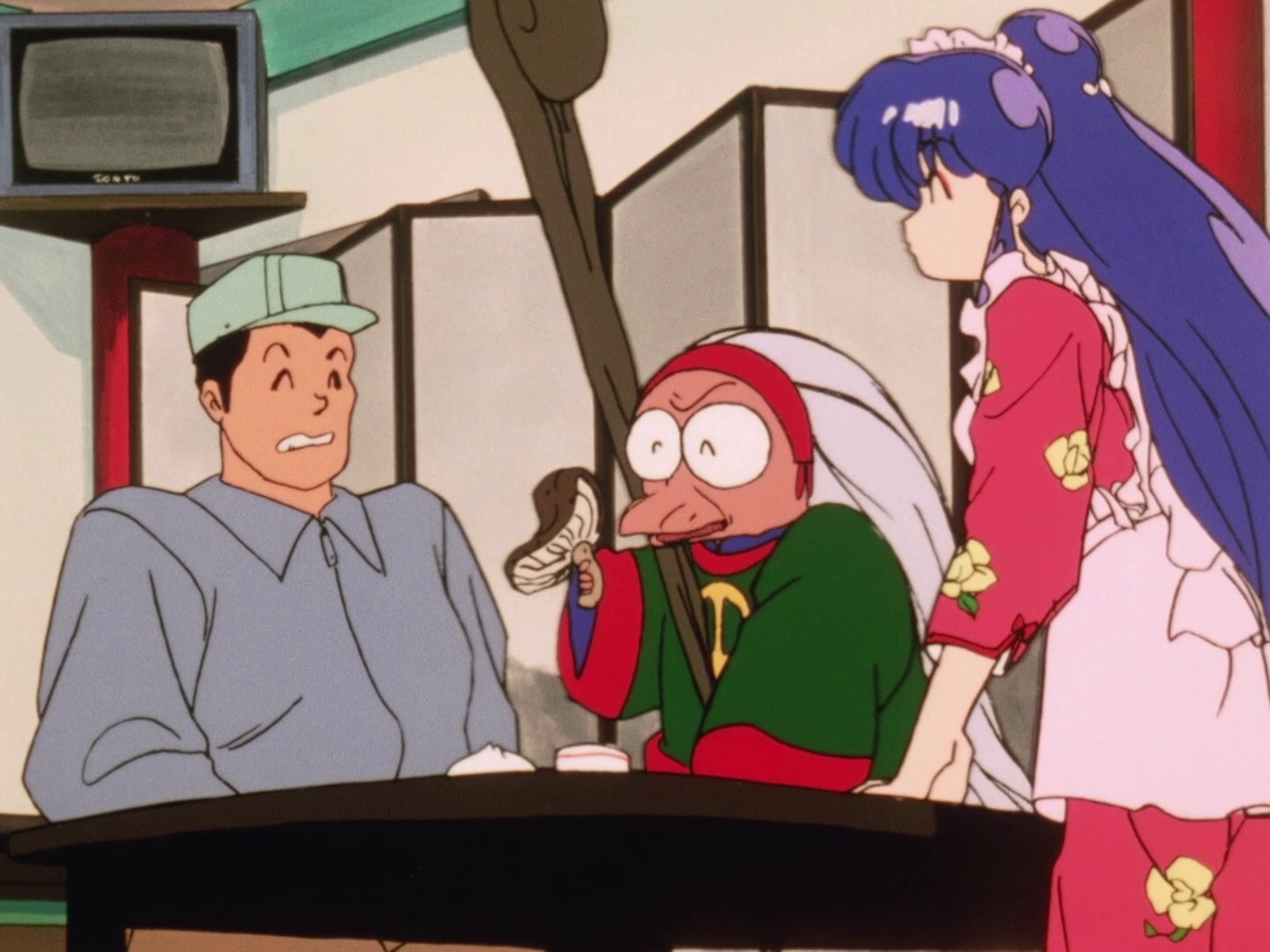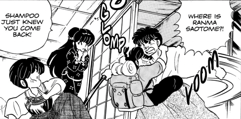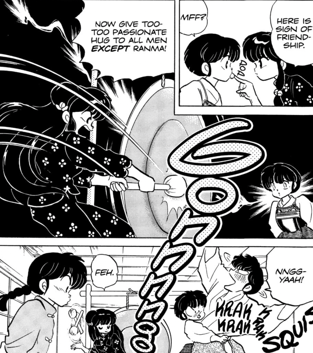 ANIME: Shampoo busts through a wall, interrupting their romantic moment, and tries to get Ranma to eat more of the kairashi. He refuses. She makes him sneeze, so he hugs her. Akane sneezes next, but when he goes to hug her, she shoves him away and begins throwing random objects at him - multiple books, pouches, cushions, cups, a kettle - and calls him a “perverted, cross-dressing, immoral sex fiend.” She throws a dumbbell at him which breaks the TV and then lifts a table next. Ranma, fed up, yells that he’s "not hugging her because he wants to!” This hurts Akane’s feelings so she drops the table (on him) and goes running dramatically back to her room.