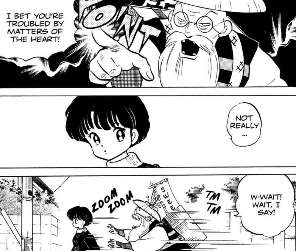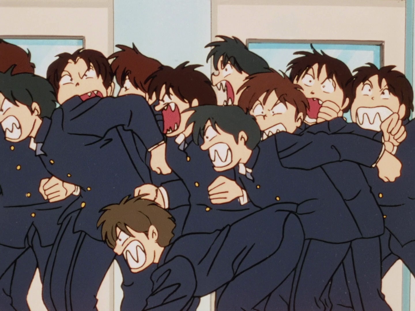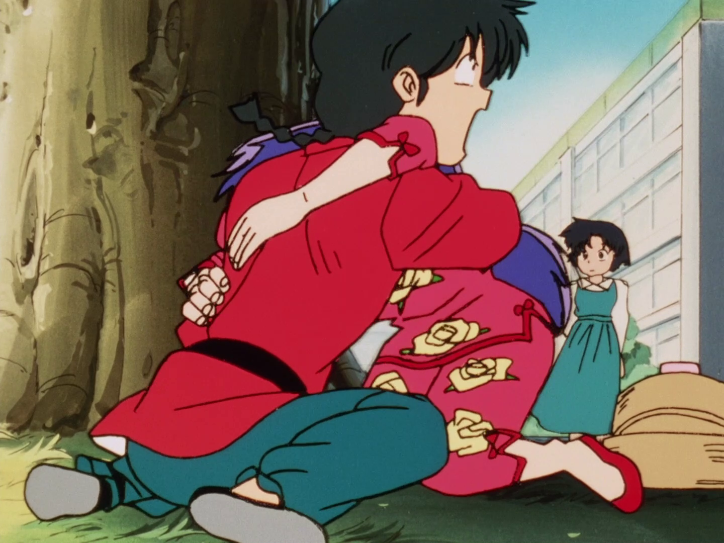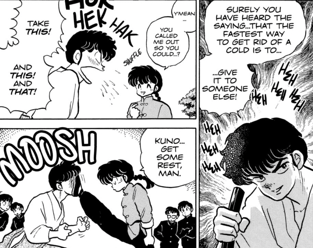 This was such a poor adaptation. The beginning of the manga was comedic gold: Kuno trying to give Ranma his cold, Ranma hugging him and trying to defend himself, then all his classmates acting horrified after being hugged too ("I feel so cheap!"). I have no idea why they removed that scene in favor of the pathetic exchange we got in the lunchroom instead. Rumiko Takahashi is a comedic genius, who had the nerve to think: "You know what? I can do better."