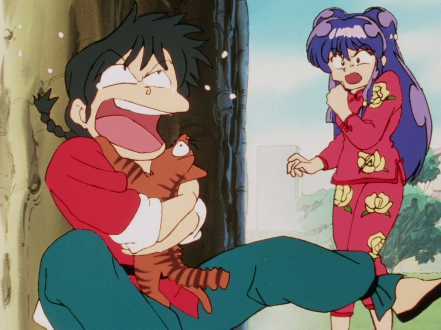 MANGA: After being punted through the door after hugging and insulting Akane again, Ranma runs into Shampoo who is outside their home in cat form. After she sneezes, Ranma hugs cat-Shampoo while screaming and crying. He jumps into a hot bath and yells at Shampoo to undo her spell. She says she doesn't want to. At this point, Akane tells him she believes him - after hitting him with a mallet since he's still in the bath with a naked Shampoo. Shampoo prepares to force a hug out of Ranma again but the pepper blows over to Akane instead who begins to sneeze repeatedly. By then, Ranma is already gone, having resolved to sleep outside. That's his plan, anyway, until he runs into Kuno who brings him right back home.