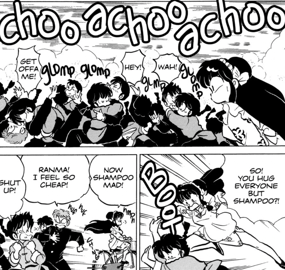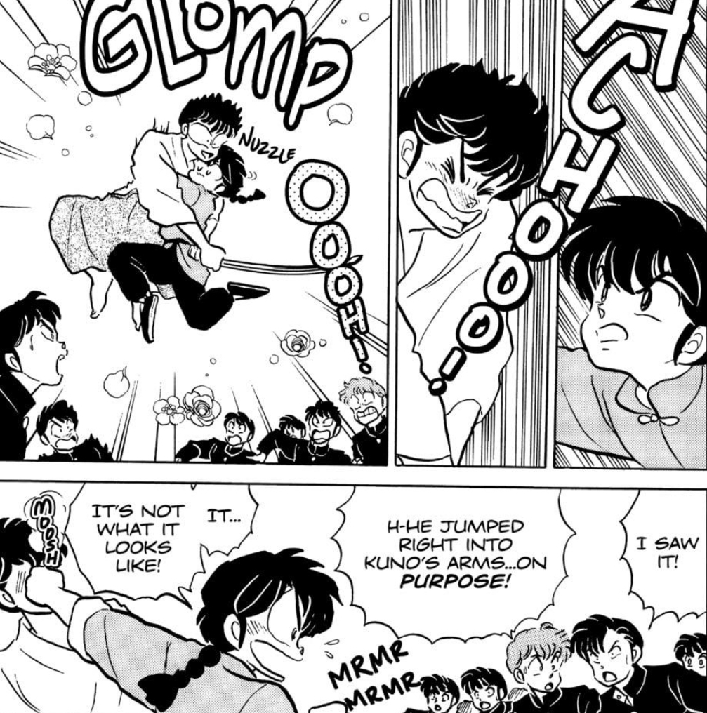 MANGA: At school, Kuno challenges Ranma to a duel, except it's a ruse to give him his cold. Shampoo finds Ranma and tricks him into eating the dumplings by pretending it's a new menu item at the restaurant. Ranma happily devours them. However, before she can snap her fingers, Kuno sneezes, changing the trigger, and all of Ranma's classmates are horrified when Ranma suddenly hugs Kuno. After learning the trigger is sneezing, not snapping, Shampoo tries to force him to sneeze by using pepper. However, the wind shifts, blowing it towards all his classmates. Ranma quickly hugs all of them instead of Shampoo, so Shampoo angrily yells at Ranma, boots him, and then storms off. She never tells him what’s going on.