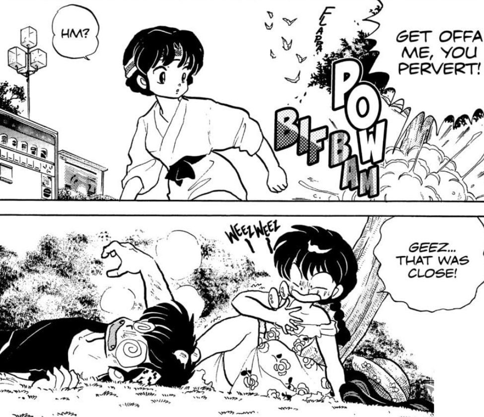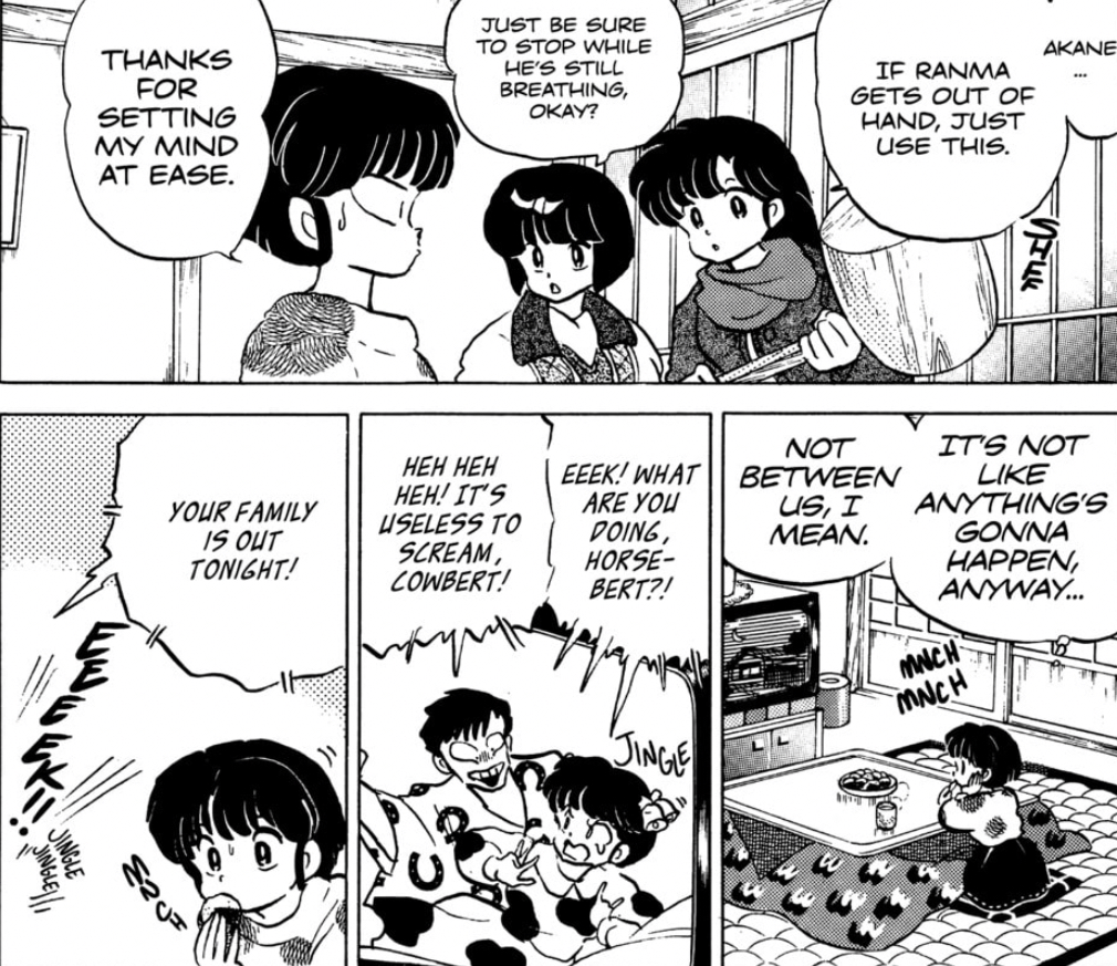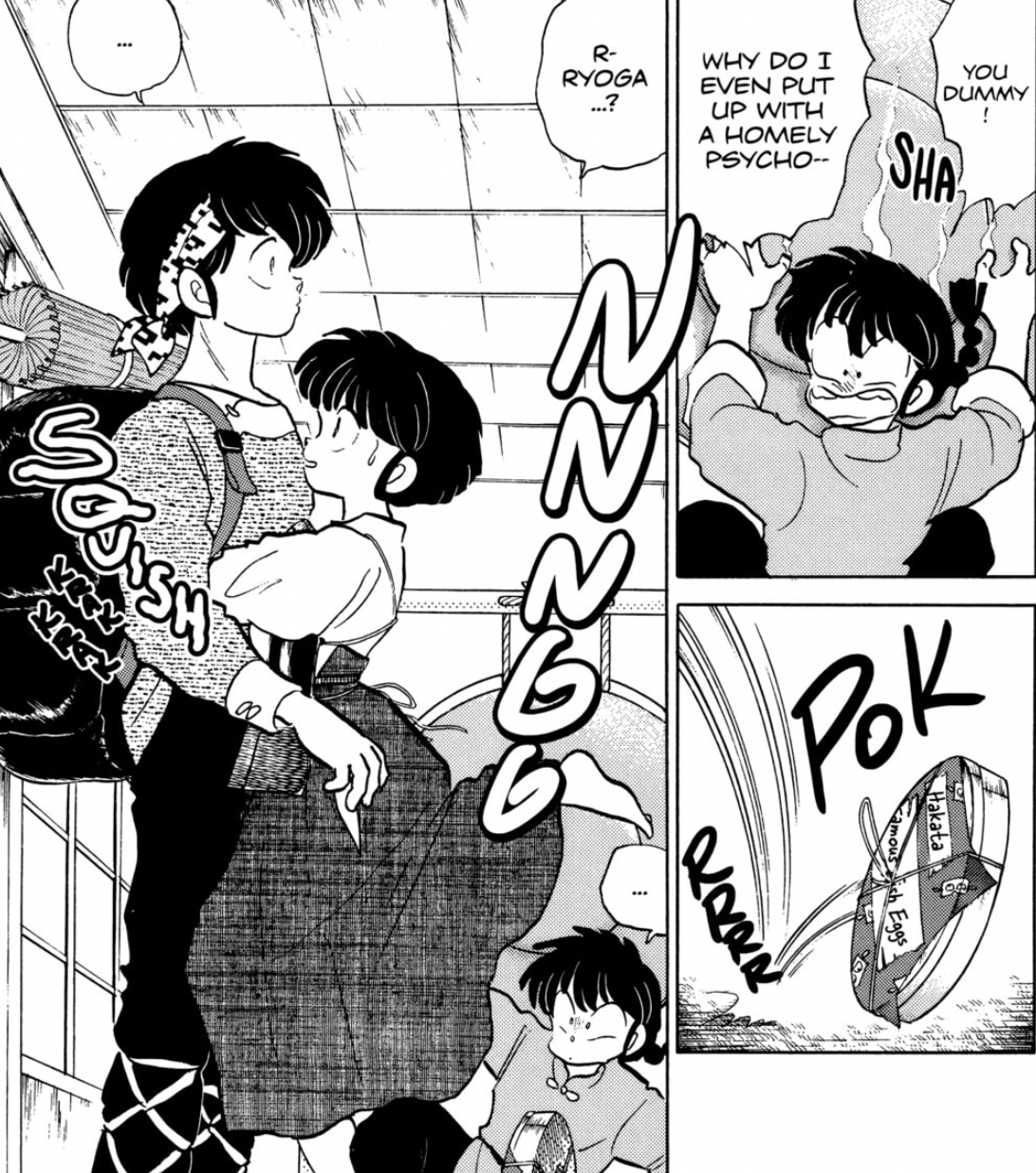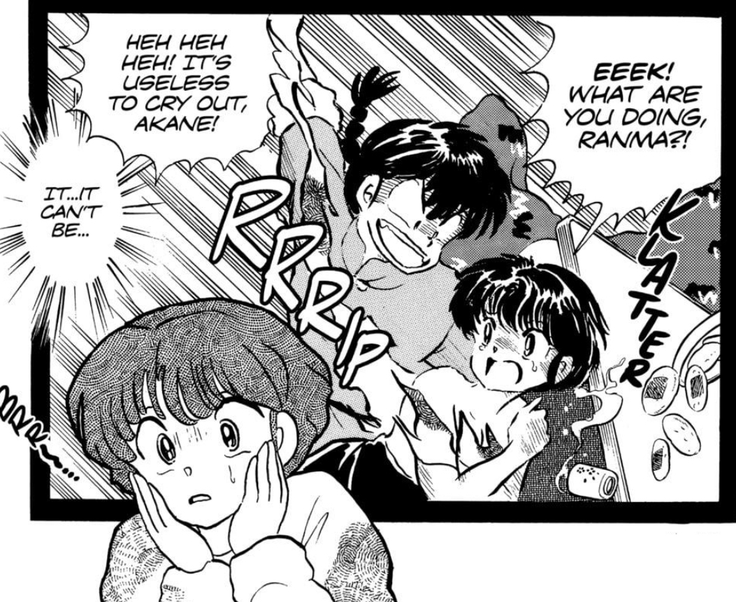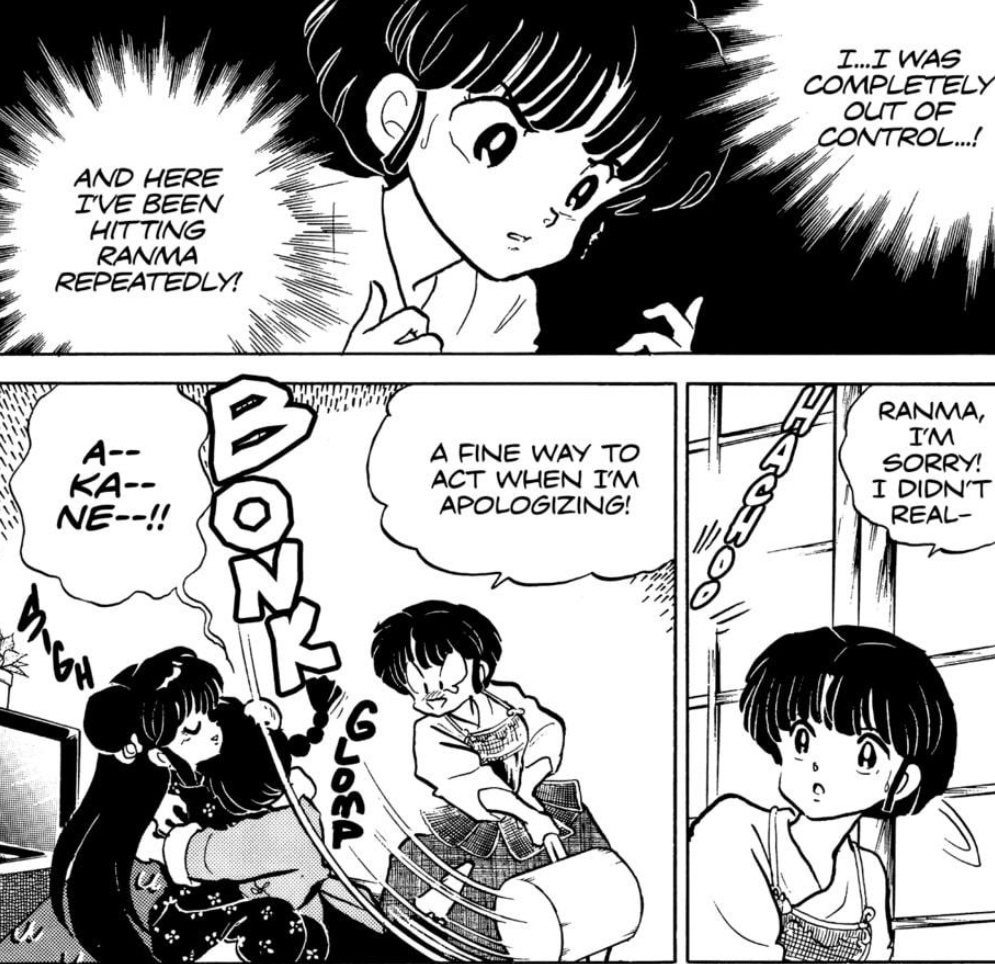 That said, manga-Akane's violence was much more justified and aligned with her character. It makes sense Akane would fear being taken advantage of after her sisters and the TV show drilled the idea into her head (even though we know Ranma never would). But from Akane's perspective, she's home alone with 1.) a boy who pretended to be a girl and only came forward after seeing her naked 2.) who snuck into her room and hugged her while she was sleeping 4.) who is much stronger than her 5.) who has gotten the approval from her father to pretty much do whatever he wants 6.) who suddenly hugged her out of nowhere the moment their family was away.