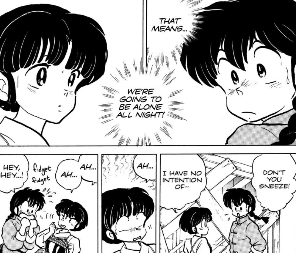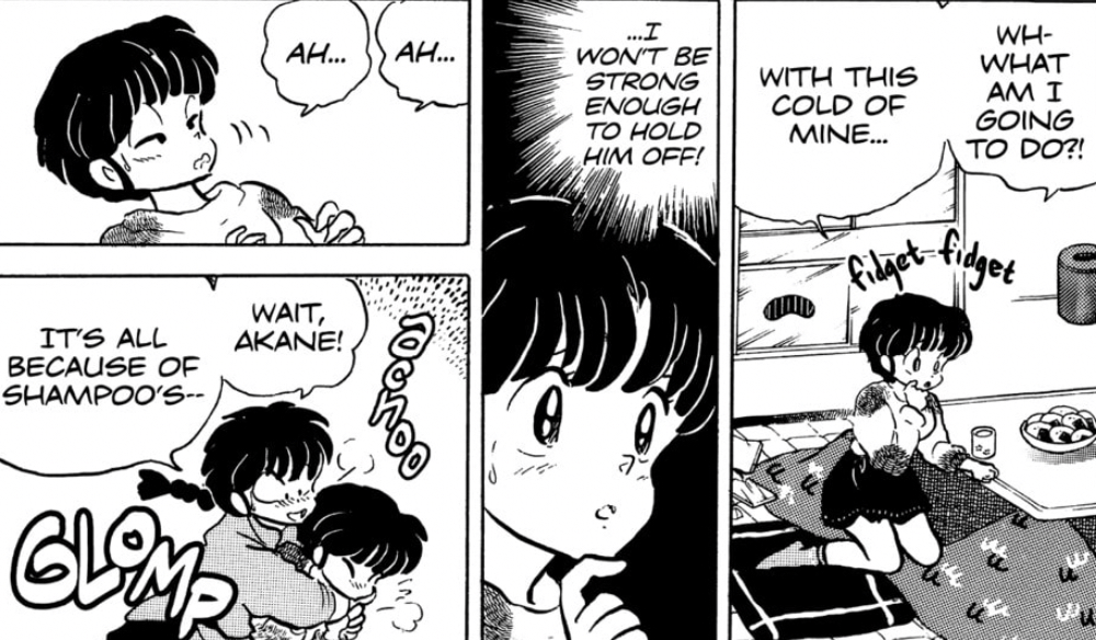 MANGA: Akane sneezes, and Kasumi observes that she has a cold. Akane is warned by Nabiki and Kasumi that she and Ranma will be home alone tonight. They tease her about protecting her virtue and tell her to beat Ranma up if he tries anything. Akane’s not worried and brushes it off as she watches TV. The show she watches is similar to her situation: a girl is home alone when she's attacked by a perverted acquaintance. Akane is then unexpectedly hugged by Ranma which is when Ranma makes the connection that sneezing is making him hug people.
