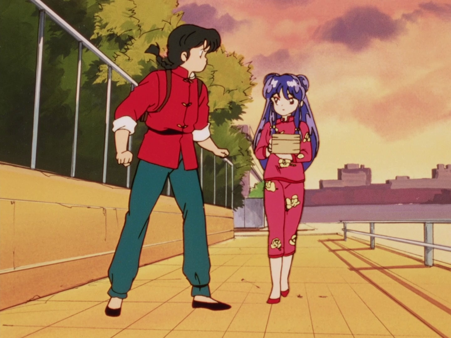 We don't see any of that in the anime. Instead, Shampoo is painted as cute, playful, not very threatening, and even helpfully explains to Ranma what she did. Unlike in the manga where Shampoo BEATS him and leaves in a huff, here, they're shown walking home together like close friends. And Ranma is shown to be kind, patient, and practically a saint towards Akane - someone who is trying to care for his shrewish, ungrateful fiancée who is sick. The sweetheart is even kind enough to give her his family's cold remedy! Yet in the manga, he insulted her, got angry/jealous himself AND intentionally tried to keep his distance to avoid the effects. In the anime, however, the burden to stay away from him is suddenly on Akane? It's HER fault for not believing him, for not staying away when he ordered her to. Meanwhile, she's depicted as angry, hateful, unreasonable, jealous, and constantly glowering.