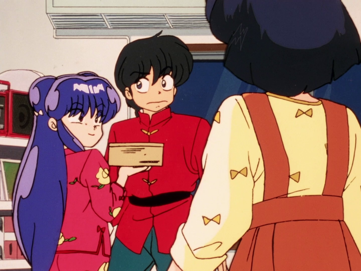 ANIME: Shampoo finds Ranma at school and offers him some buns she made. All the male classmates are jealous and drool in envy, but Ranma's not interested. They offer to eat it instead, so Shampoo drags Ranma outside for some alone time while the boys start yelling and acting like wild dogs? I don't know. Akane runs through the school looking for Ranma because she has something important to tell him. Outside, after feeding him the buns, Shampoo tries to set her trigger to a snap, but before she can, a cat sneezes and Ranma hugs the cat instead. Realizing the trigger has changed, Shampoo gets Ranma to hug her repeatedly, and at that moment, Akane witnesses them hugging. Ranma begs for Akane to listen to him but she ignores him, and after forcing a smile, tells him he’s supposed to watch the house tonight.
