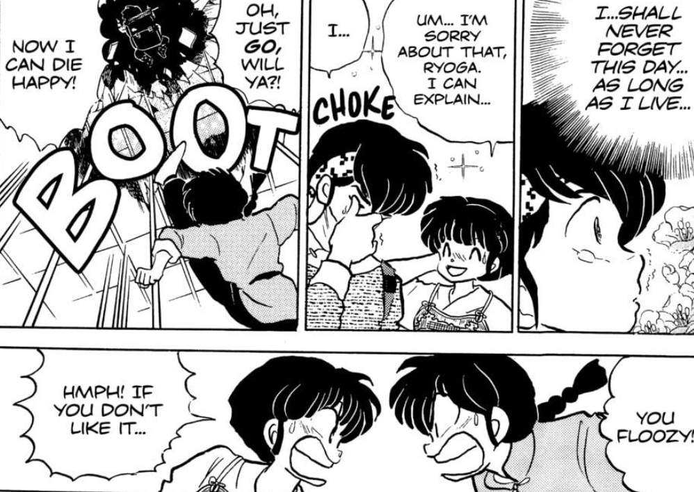 MANGA: Furious at Ranma for popping her ears, Akane punches him and sends him flying right into the gong - and Akane is suddenly hugging Ryoga. Ryoga, confused but overjoyed, decides he'll never forget this day as long as he lives. Ranma boots him out the roof then turns to Akane and calls her a floozy. Akane tells him that if he doesn't like it he should find a way to cancel the spell. She hits him with the gong, breaking it. She taunts Shampoo, saying that now she has nothing to worry about. Shampoo attacks again prepared to feed her another mushroom but Kuno returns after repairing the gong, stealing a hug for himself. Ranma boots him as Akane complains that she's sick of this.