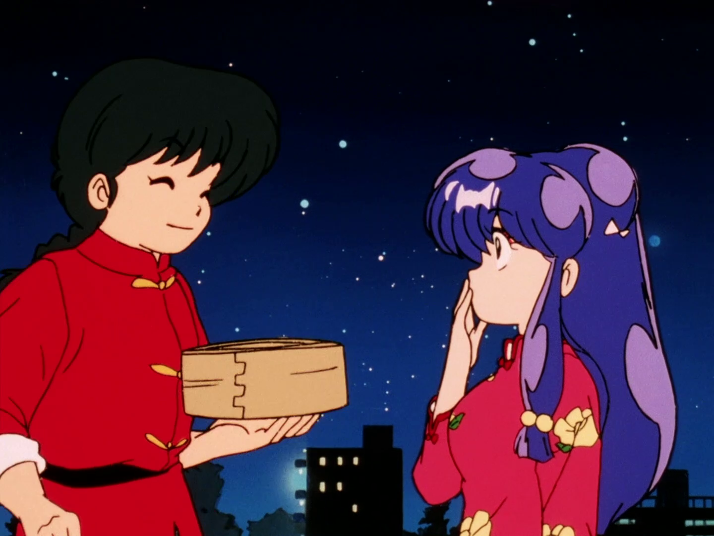 ANIME: After Ranma refuses to eat her buns, Shampoo threatens to feed them to Akane instead. Panicked, Ranma grabs Akane and runs, escaping to the roof while ordering her not to eat any. Ranma manages to steal the mushrooms from Shampoo after calling her cute and hugging her, then tricks her into eating one and orders her to go home. Finally, Akane admits she believes him. Akane sneezes again, but the effects have worn off. They laugh and when their family returns home that night, it's to find Kasumi has brought them steamed buns, and she wonders why they're not hungry.