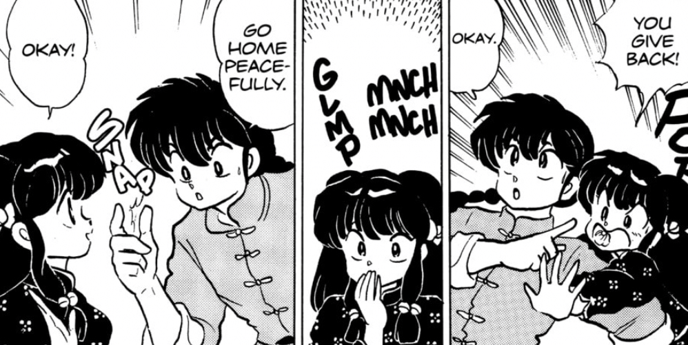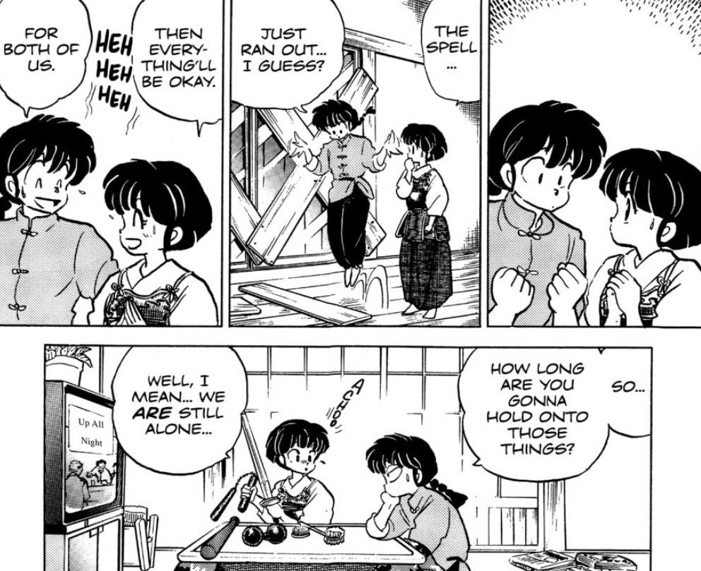 MANGA: Ranma resolves to put an end to this nightmare. He plops a dumpling in Shampoo's mouth and tells her to go home. Shampoo cheerfully obeys and waves goodbye as she busts through the door and wall. Once she's gone, Ranma and Akane quickly work together to board the house. When they're finished, they freeze, realizing this means they're going to be home alone. Ranma warns Akane not to sneeze but she does, and after Ranma doesn't react, they realize the effects have worn off. They laugh in relief. Later, the two relax while watching TV. Ranma points out, unamused, that Akane's still holding her weapons. "Well, we are still alone," she tells him.