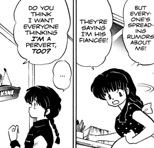 But first, I need to address the elephant in the room: I know people take issue with the plot line that Akane-fears-Ranma-will-rape-her, but this is a recurring joke in the world of Ranma, and even though it's not a funny subject it's almost always played for laughs. Like murder. It's not meant to be taken seriously. And it's not exclusive to Akane either: Ranma had to fight off Ryoga multiple times while disguised as his fake-fiancée, Shampoo tries to force Ranma while under the influence of the imprinting egg, Ranma pretends he sexually assaulted Akane during the Hiryū Shōten Ha arc, Akane has to save Ranma from Kuno multiple times, and the list goes on. And Akane, who was harassed by a group of boys every morning, has every right to harbor this particular fear. Character-wise, it makes sense. More sense than Akane acting like an insufferable brat because Ranma hugged someone else (he's known as a pervert for a reason, and it's rarely in reference to his curse).