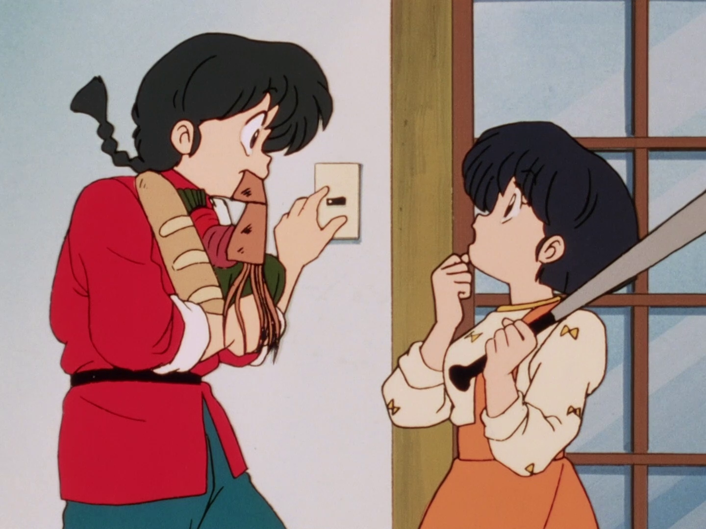 ANIME: Akane watches a music video. She locks the house, hears someone entering and goes to investigate, armed with a bat. She finds Ranma sneaking food from the fridge. She complains that he didn't use the doorbell and tells him Kasumi left him some food. Once he spots her medicine, Akane confirms she has a cold. He reacts like a crazy person and Akane becomes offended, incorrectly assuming he was worried about her. Ranma repeatedly tells her to stay away. She doesn’t. She sneezes, Ranma hugs her, and Akane proceeds to beat him repeatedly - with a bat, frying pan, tea kettle, etc. He tries to explain again, but she doesn’t believe him. This time, she throws a microwave and threatens him with a rice cooker. When she almost faints, Ranma tries to catch her, but she gets angry (again) and glares at him before wandering away.