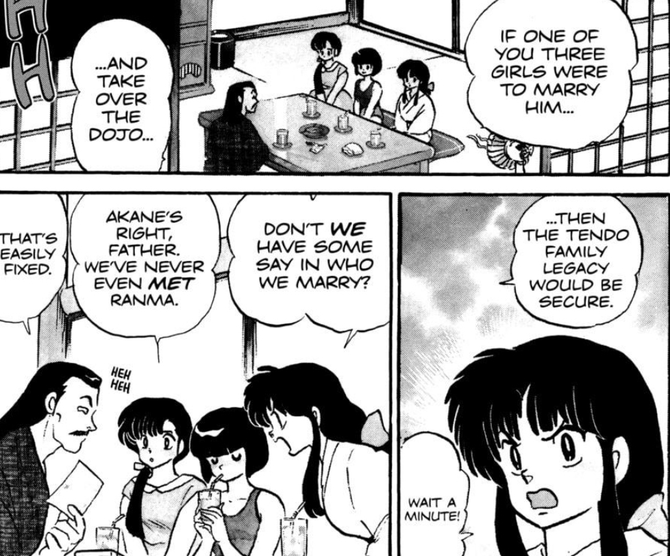 2.) The fact that these two girls are strong doesn't matter. Akane is strong - that's one of her well-known, defining characteristics - but she's still not qualified in her father's eyes to carry on the dojo. Why? Because she's female. For Soun, strength isn't important when it comes to the female line. This is made clear from the very beginning when he says it doesn't matter which daughter marries Ranma . . . Kasumi and Nabiki aren't martial artists, but they're just as qualified as Akane to inherit and pass down their genes. Which means Soun doesn't necessarily care if their offspring is inhumanly strong or not; he's not trying to ensure strong children like the Amazons. If he was, he would have chosen Akane from the start since she's the only martial artist among them. So even in this instance, strength is reserved for the men. That's because Soun didn't have sons, so he needs a strong son-in-law to carry on his family's legacy, and two random girls showing up would not suddenly change this. Even if they do have a blurry photo signifying as much.