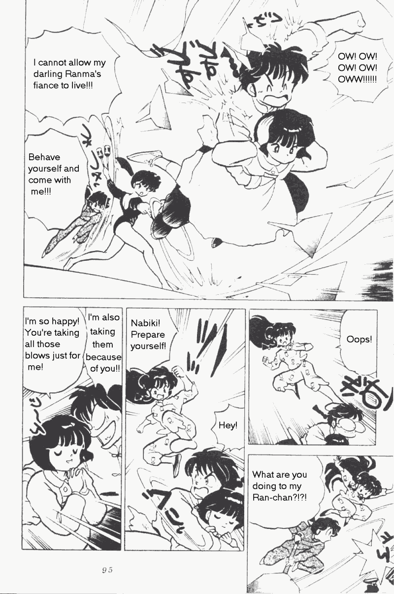 This arc is a great example of how violent and cutthroat Ranma's fiances can be. Not only do they attack Ranma indiscriminately, but they attempt to eliminate his "new" fiance, Nabiki—someone who can't even defend herself. And not only do they seek to get her out of the way, they attempt to accomplish this by KILLING her.
