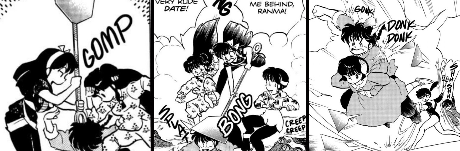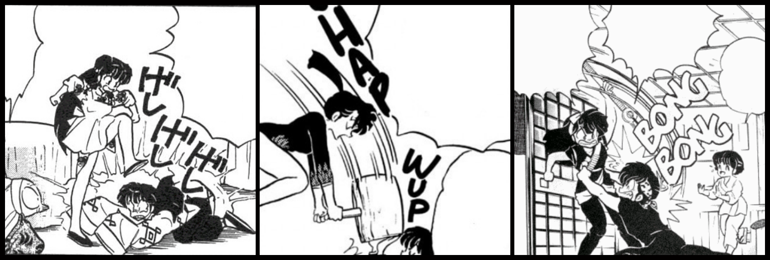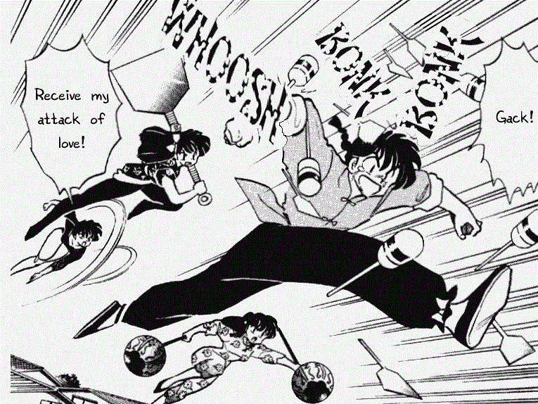 At least Akane's reasons for hitting Ranma and others is very clear and consistent: If Ranma insults her, or she's being attacked/groped, she lashes out. However, with Ukyo, Shampoo, and Kodachi, their violence is all over the place: Shampoo runs people over with a smile on her face; she's turned herself into a cat in order to punish Ranma; Ukyo will hit someone when embarrassed, disturbed, or annoyed; Kodachi doesn't need any reason at all to be violent. Plus, all three of them have no qualms against eliminating competition, whether the people they view a threat are trained martial artists or not (See Example 1 and Example 2).