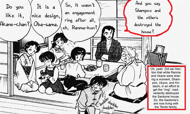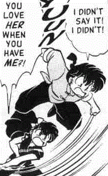 One of the major complains uninformed people seem to have concerning the Ranma/Akane pairing is that Akane is the "only/most" violent fiance. Now, I'm not trying to argue that Akane's not violent (though I will argue that when she hits him it's usually with good reason); however, I think it's unfair to condemn Akane for beating on Ranma when ALL his fiances are guilty of the same thing. Usually, anti-Akane fans tend to view Shampoo or Ukyo as Saints who can do no wrong; however these examples (and there are plenty more), prove this isn't always the case. Akane may get angry and hit him, but it's no where near as exaggerated as it is in the anime. In fact, Ranma's other fiancée's are just as violent, if not more so.